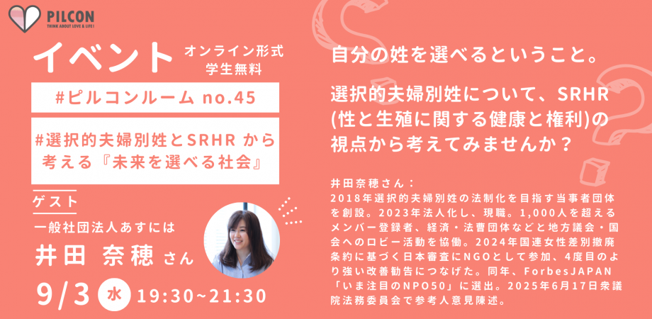 ユース世代向けオンラインイベント「#ピルコンルーム」。今回は、選択的夫婦別姓の実現を目指し活動する一般社団法人あすには代表理事の井田奈穂さんをゲストにお招きし、「選択的夫婦別姓」をテーマにお話を伺います。
