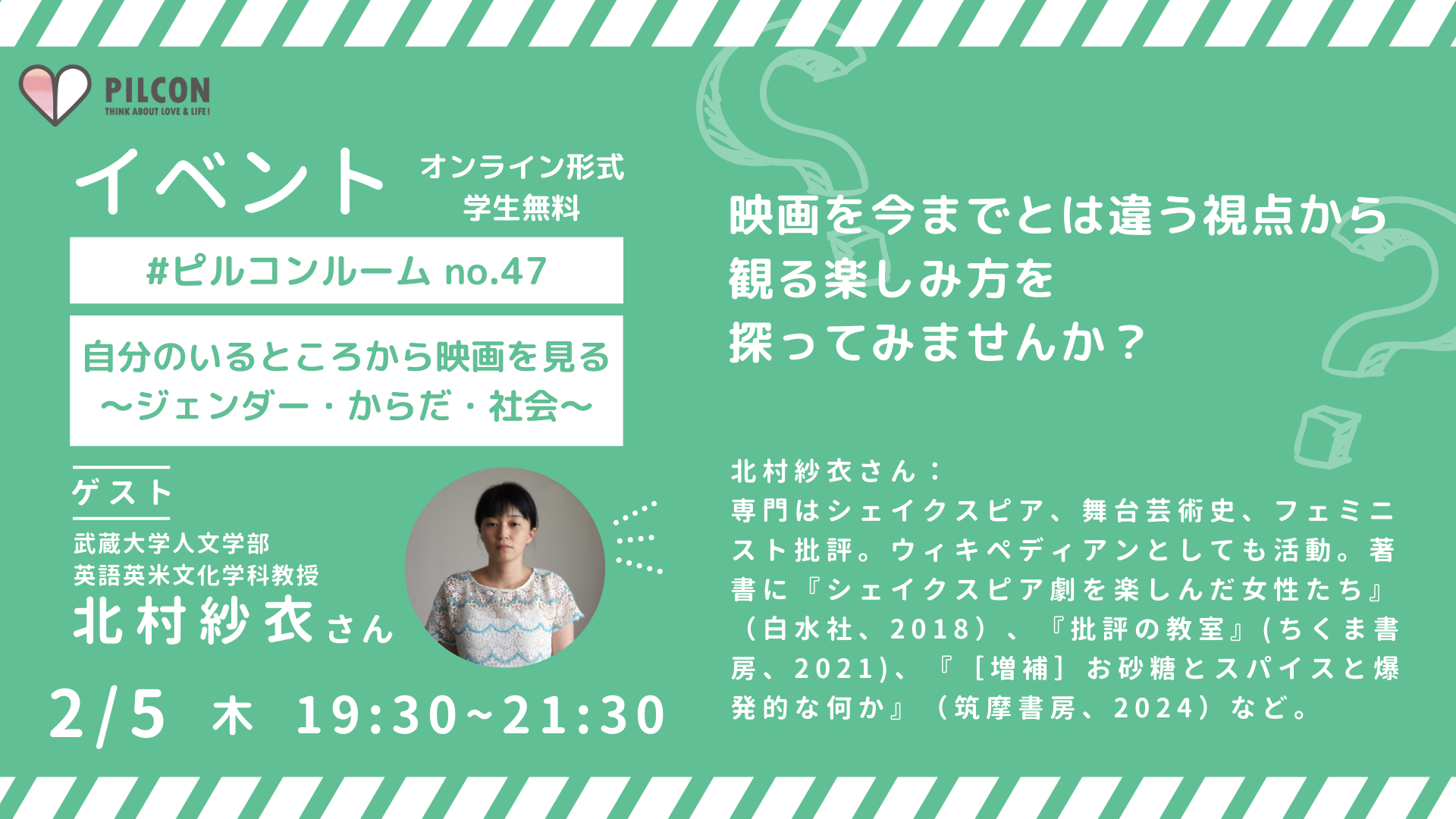 ユース世代向けオンラインイベント「#ピルコンルーム」。今回は、『女の子が死にたくなる前に見ておくべきサバイバルのための洋画100選』や『学校では教えてくれないシェイクスピア』などの書籍の著者である北村紗衣さんをゲストにお招きし、「映画とジェンダー」をテーマにお話を伺います。