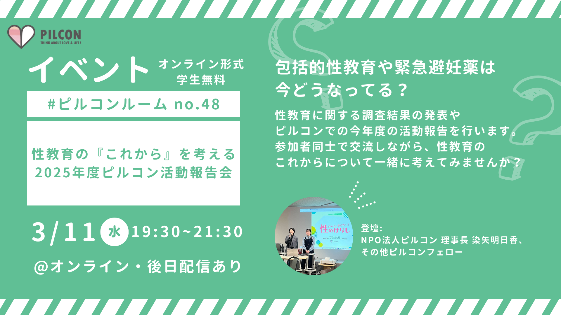 ユース世代向けオンラインイベント「#ピルコンルーム」。今回の2025年度ピルコン活動報告会では、ピルコンの活動を振り返りながら、包括的性教育と緊急避妊薬のアンケート結果をもとに、SRHR(性と生殖に関する健康と権利)のために、若者ができるアクションを探っていきます。